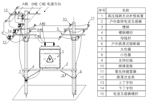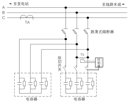 TBBZ系列高壓線路無功補償裝置主要由控制器,真空接觸器,電容器,電壓互感器,綜合保護器等組成。系統(tǒng)通過線路開啟式電流互感器采集線路電流信號,分析判斷線路無功功率缺失容量,控制電容器組的投切,使功率因數(shù)達到設(shè)定目標(biāo)值。裝置采用戶外跌落式熔斷器對進行短路保護,一旦裝置有短路故障,跌落式熔斷器立即跳開,防止對裝置和線路造成損害。