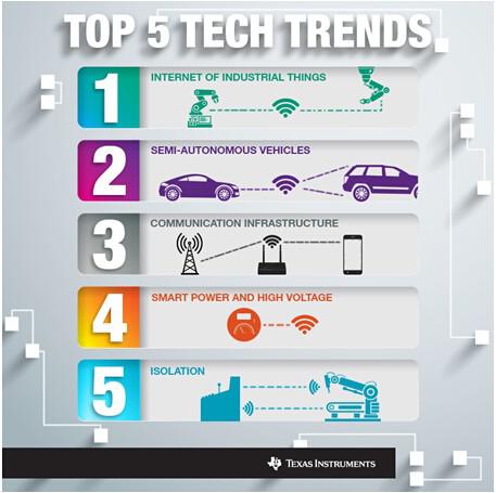 在迎接2015到來(lái)之際,我們有必要花時(shí)間來(lái)評(píng)估和預(yù)測(cè)未來(lái)的一年中將會(huì)出現(xiàn)的技術(shù)挑戰(zhàn)和突破創(chuàng)新。通過(guò)與眾多戰(zhàn)略客戶、大學(xué)合作伙伴以及TI產(chǎn)品線的技術(shù)專家進(jìn)行探討后,我們認(rèn)為TI將在一些重要技術(shù)趨勢(shì)中發(fā)揮戰(zhàn)略性作用。這些技術(shù)趨勢(shì)正推動(dòng)著汽車和工業(yè)等多個(gè)市場(chǎng)的發(fā)展,而在此過(guò)程中,TI的工程師將幫助應(yīng)對(duì)半導(dǎo)體技術(shù)領(lǐng)域的獨(dú)特挑戰(zhàn),并利用先進(jìn)技術(shù)改善我們的生活。